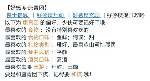 以上就是羊托游小编为你带来的《天涯明月刀手游》唐青团喜好物品介绍的全部内容,更多精彩活动资讯尽在羊托游手游网, 想知道更多热点游戏资讯的小伙伴欢迎点击关注收藏本网站哦。