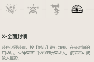 装备封锁装置。按【射击】进行部署。在长时间的启动后,束缚有效半径内的所有敌人。该装置可被敌人摧毁。