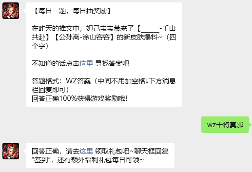 注:答题格式:WZ答案(中间不用加空格↓下方消息栏回复即可),回答正确100%获得游戏奖励哦!