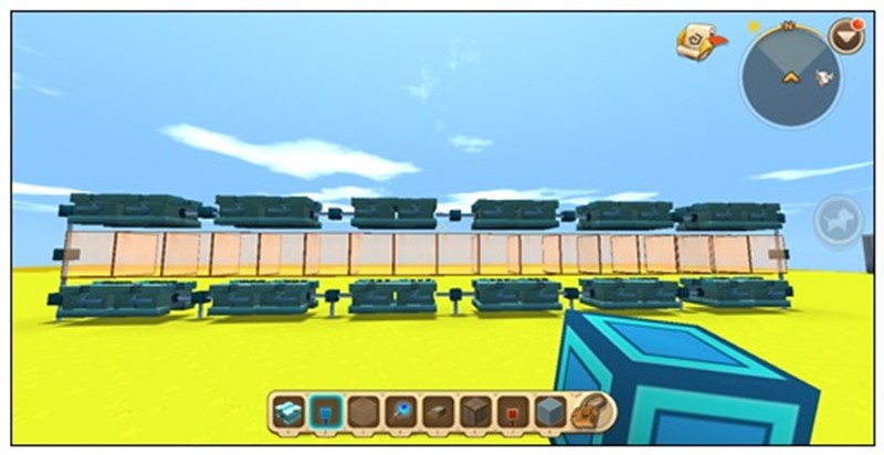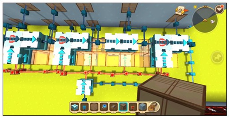 为了避免电能线出现串联的情况,第二层电路在摆放时要和第一层间隔一格。用玻璃这类方块做好隔离后,再把两层电路连接起来,形成完整的循环路径。