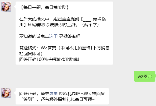 今日问题:在昨天的推文中,妲己宝宝提到【____-青衿临川】60点券秒杀皮肤即将上线。(两个字)