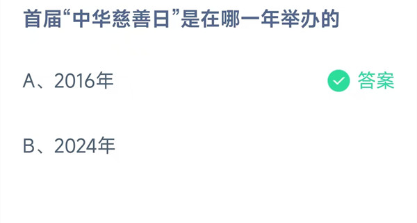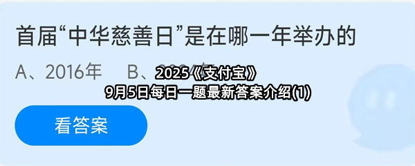 首届“中华慈善日”是在哪一年举办的?这是今天《支付宝》每日一题的问题,相信我们很多用户都很想知道这个问题的答案是什么?这么一个可以领取饲料的机会相信我们很多用户都不想错过,这里羊托游小编为你带来了2025《支付宝》9月5日每日一题最新答案介绍(1)的全部内容,喜欢的小伙伴欢迎点击进入看看吧。