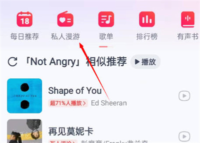1、打开网易云音乐,点击上方的私人漫游功能,如图所示。
