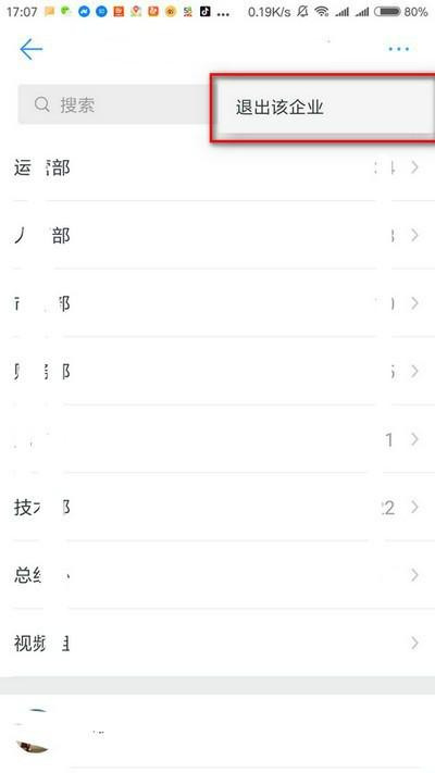 4、点击菜单按钮后,在弹出的功能选项中,可看到 “退出该企业” 的功能,点击该选项。