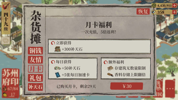 3、若补天石仍不够用,可选择月卡叠加的方式,先直接获得 300 补天石,之后每天还能领取 50 补天石,持续 30 天,总计可获得 1800 补天石,此外还能解锁仓库无限储值和加速卡的权益;