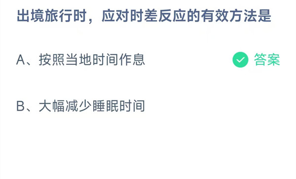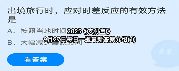 出境旅行时,应对时差反应的有效方法是?这是今天《支付宝》每日一题的问题,相信我们很多用户都很想知道这个问题的答案是什么?这么一个可以领取饲料的机会相信我们很多用户都不想错过,这里羊托游小编为你带来了2025《支付宝》9月27日每日一题最新答案介绍(1)的全部内容,喜欢的小伙伴欢迎点击进入看看吧。