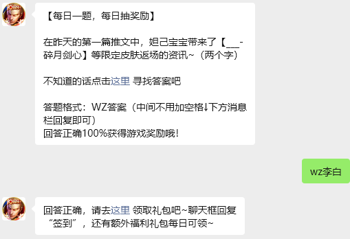 今日问题:在昨天的第一篇推文中,妲己宝宝带来了【___-碎月剑心】等限定皮肤返场的资讯~(两个字)