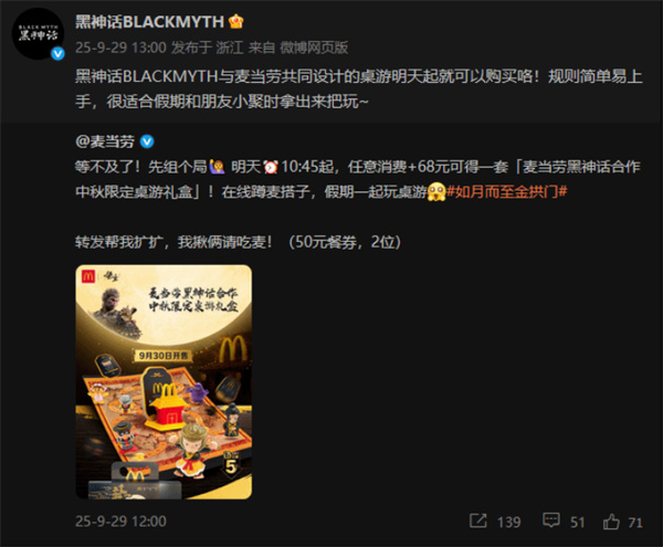 《黑神话》官博也同步转发确认,这款桌游由麦当劳与《黑神话:悟空》双方团队联合设计,其规则简明易懂,玩家能够轻松上手体验。随着中秋佳节的临近,这波联动不仅营造了浓厚的节日氛围,还为游戏爱好者增添了别样的收藏价值。
