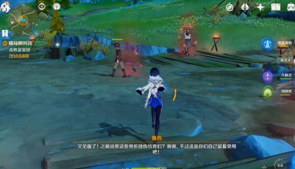 2、接着按照任务剧情的指引,找到盗宝团成员与红发青年的所在处,随后协助红发青年一同击败在场的盗宝团敌人。