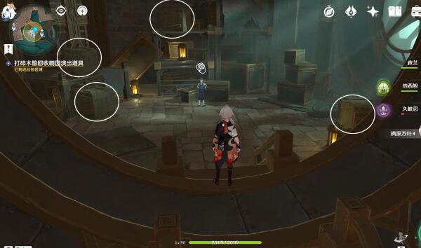 5、在破烂骨头商店附近,攻击图中标注的 4 个木箱,击破后对木箱位置进行调查。
