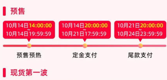 1、预售预热:2025 年 10 月 14 日 14:00:00-2025 年 10 月 14 日 19:59:59,可提前加购商品、了解定金优惠,为后续支付做准备。
