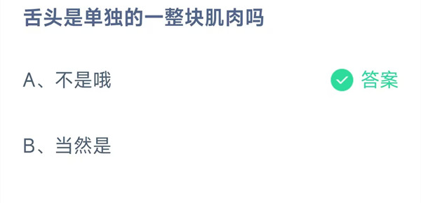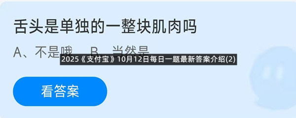 舌头是单独的一整块肌肉吗?这是今天《支付宝》每日一题的问题,相信我们很多用户都很想知道这个问题的答案是什么?这么一个可以领取饲料的机会相信我们很多用户都不想错过,这里羊托游小编为你带来了2025《支付宝》10月12日每日一题最新答案介绍(2)的全部内容,喜欢的小伙伴欢迎点击进入看看吧。