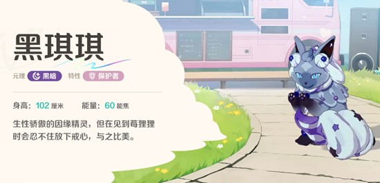 暗黑风格精灵,黑紫配色,身高102cm,能量60,设定为黑暗系保护者,形成鲜明反差。可能具备牺牲自身守护队友的机制,策略价值高。