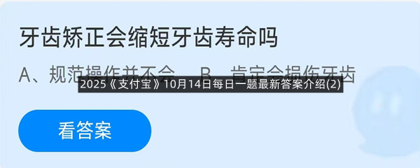 牙齿矫正会缩短牙齿寿命吗?这是今天《支付宝》每日一题的问题,相信我们很多用户都很想知道这个问题的答案是什么?这么一个可以领取饲料的机会相信我们很多用户都不想错过,这里羊托游小编为你带来了2025《支付宝》10月14日每日一题最新答案介绍(2)的全部内容,喜欢的小伙伴欢迎点击进入看看吧。
