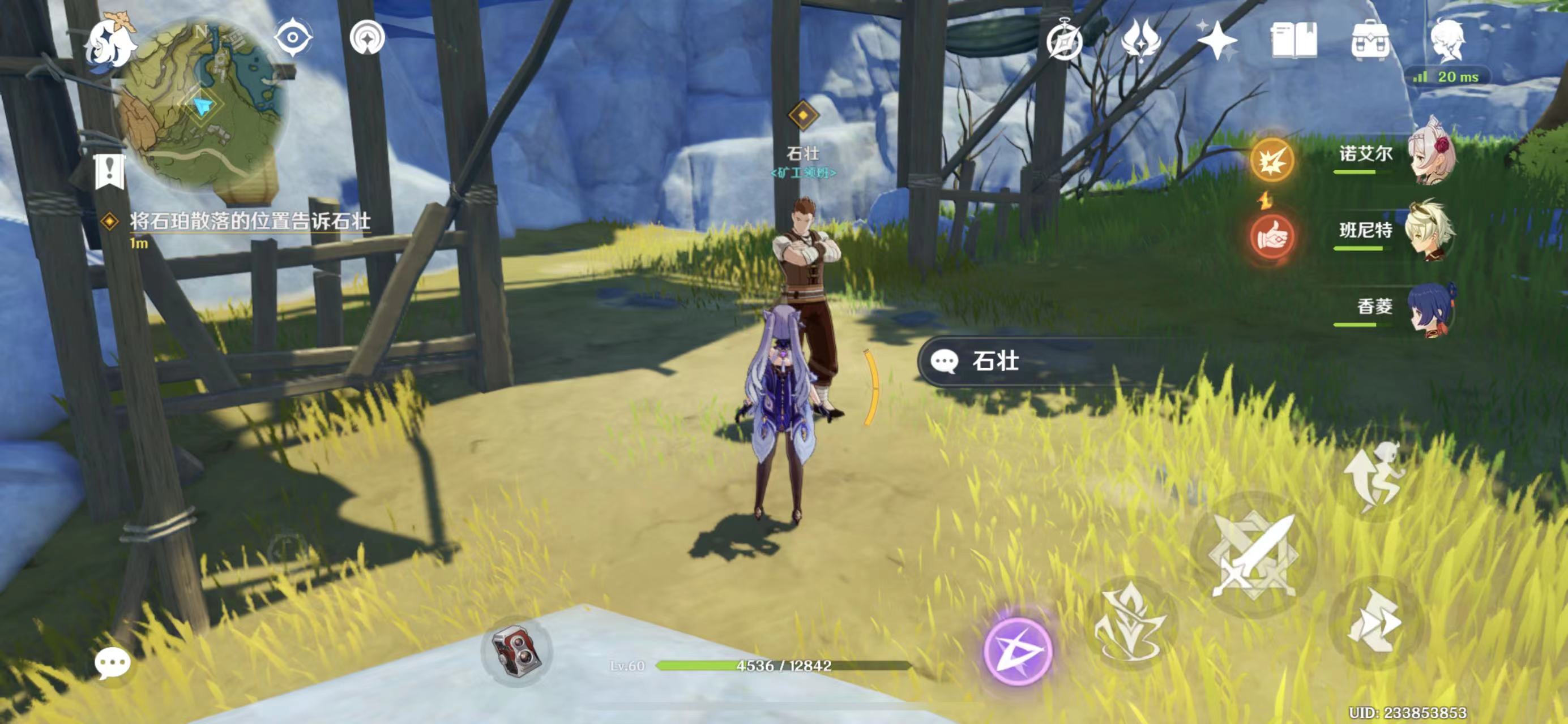 5、找到矿车后,将石珀散落的位置告诉石壮:返回之前与石壮对话的地点,再次与他对话说明情况。