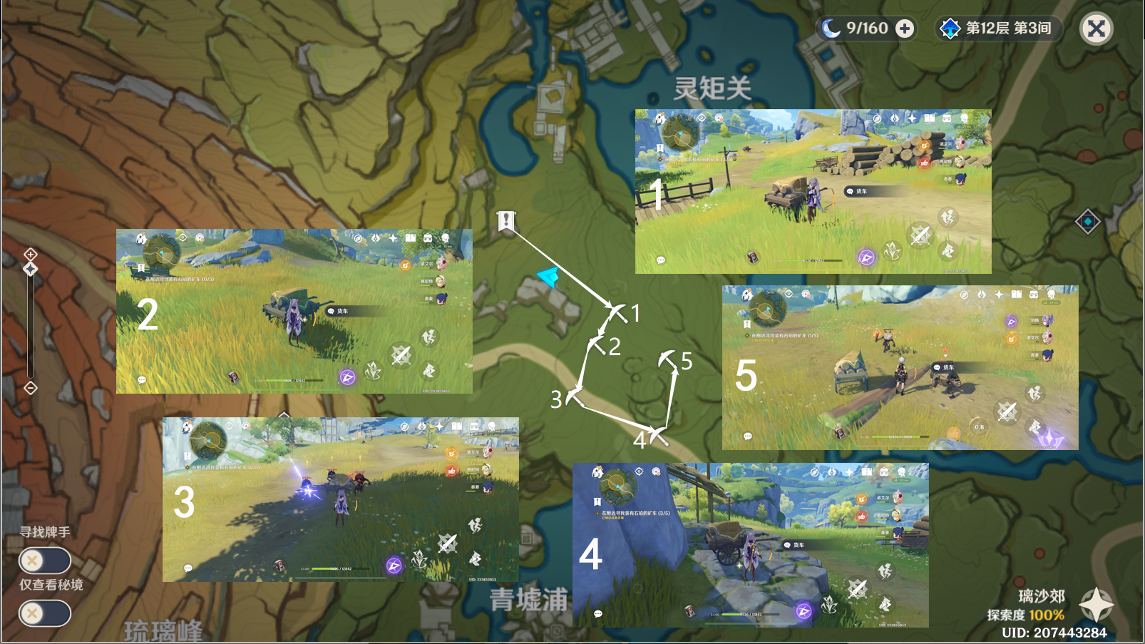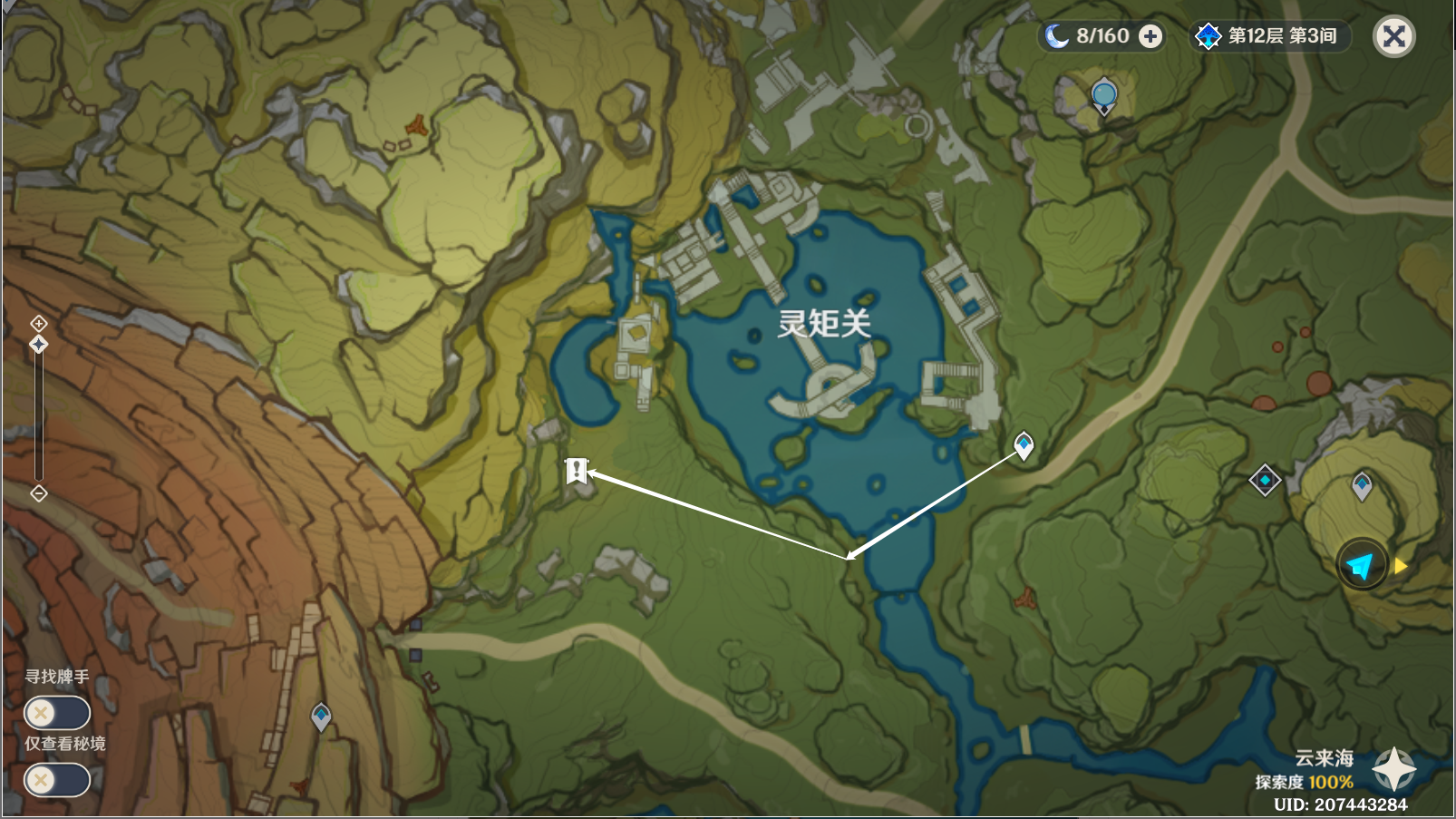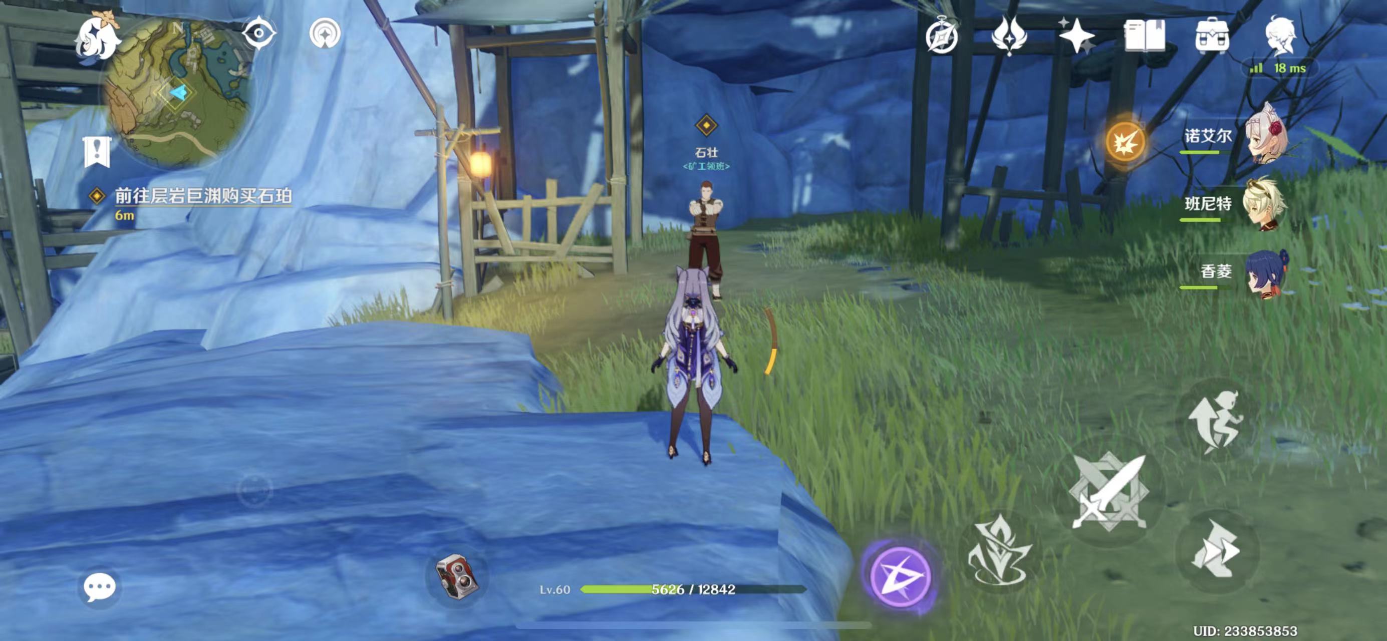 3、然后前往层岩巨渊购买石珀:传送到灵矩关图中标注的锚点,按照图中的指引路线前进,抵达后与石壮对话。