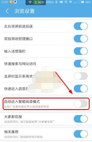 5、在浏览设置页面中,找到【自动进入智能阅读模式】选项,点击其右侧的开关将其打开。