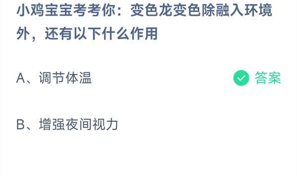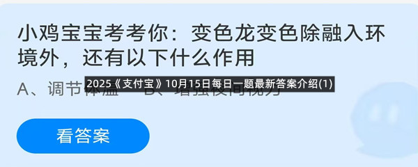 小鸡宝宝考考你:变色龙变色除融入环境外,还有以下什么作用?这是今天《支付宝》每日一题的问题,相信我们很多用户都很想知道这个问题的答案是什么?这么一个可以领取饲料的机会相信我们很多用户都不想错过,这里羊托游小编为你带来了2025《支付宝》10月15日每日一题最新答案介绍(1)的全部内容,喜欢的小伙伴欢迎点击进入看看吧。