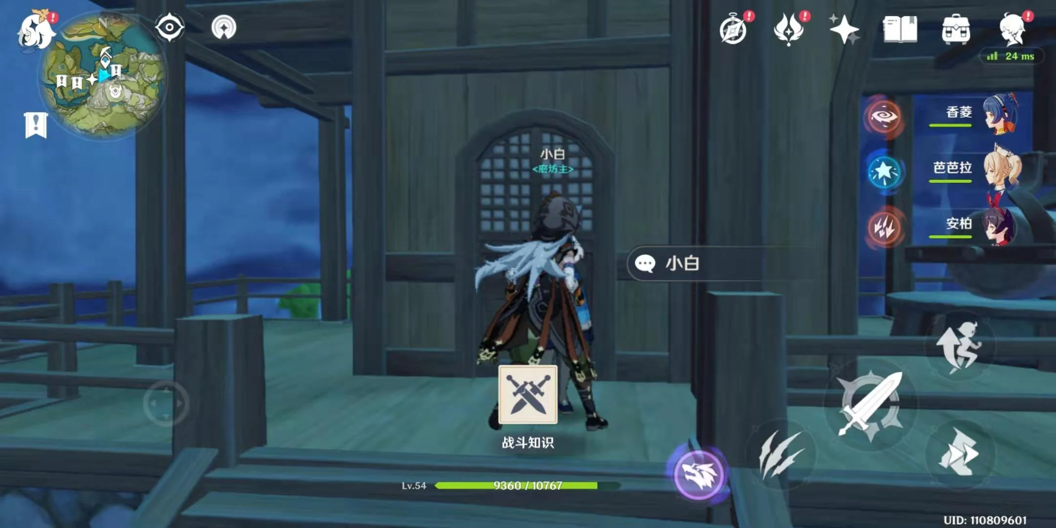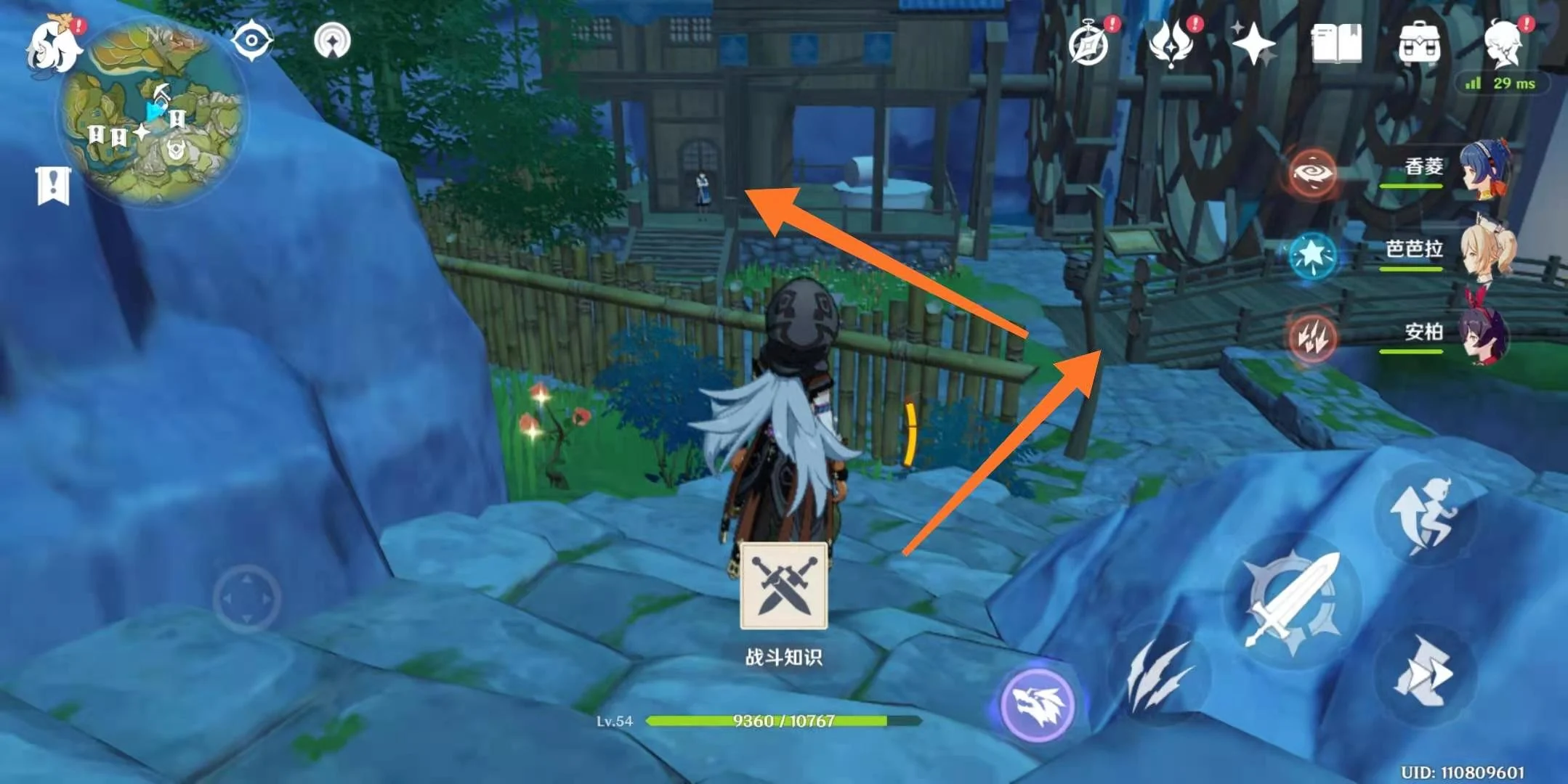 2、接着向左转弯,不需要经过前方的桥梁,就能看到磨坊主小白站在磨坊的门口。