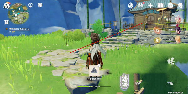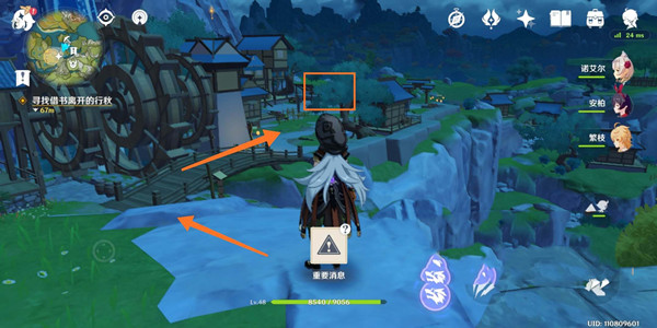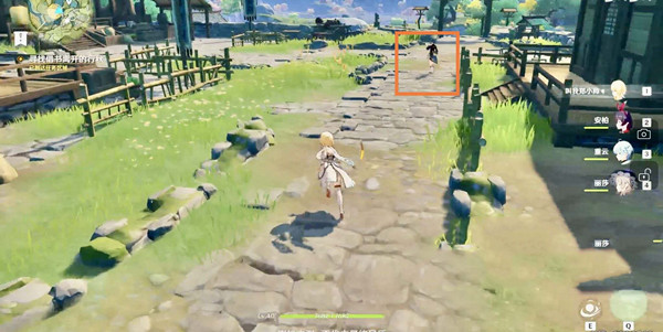 3、之后要寻找借走书离开的行秋。依旧先传送到轻策庄的传送点,传送后往北边方向走,通过木桥后,对面房子的前面站着的就是行秋。