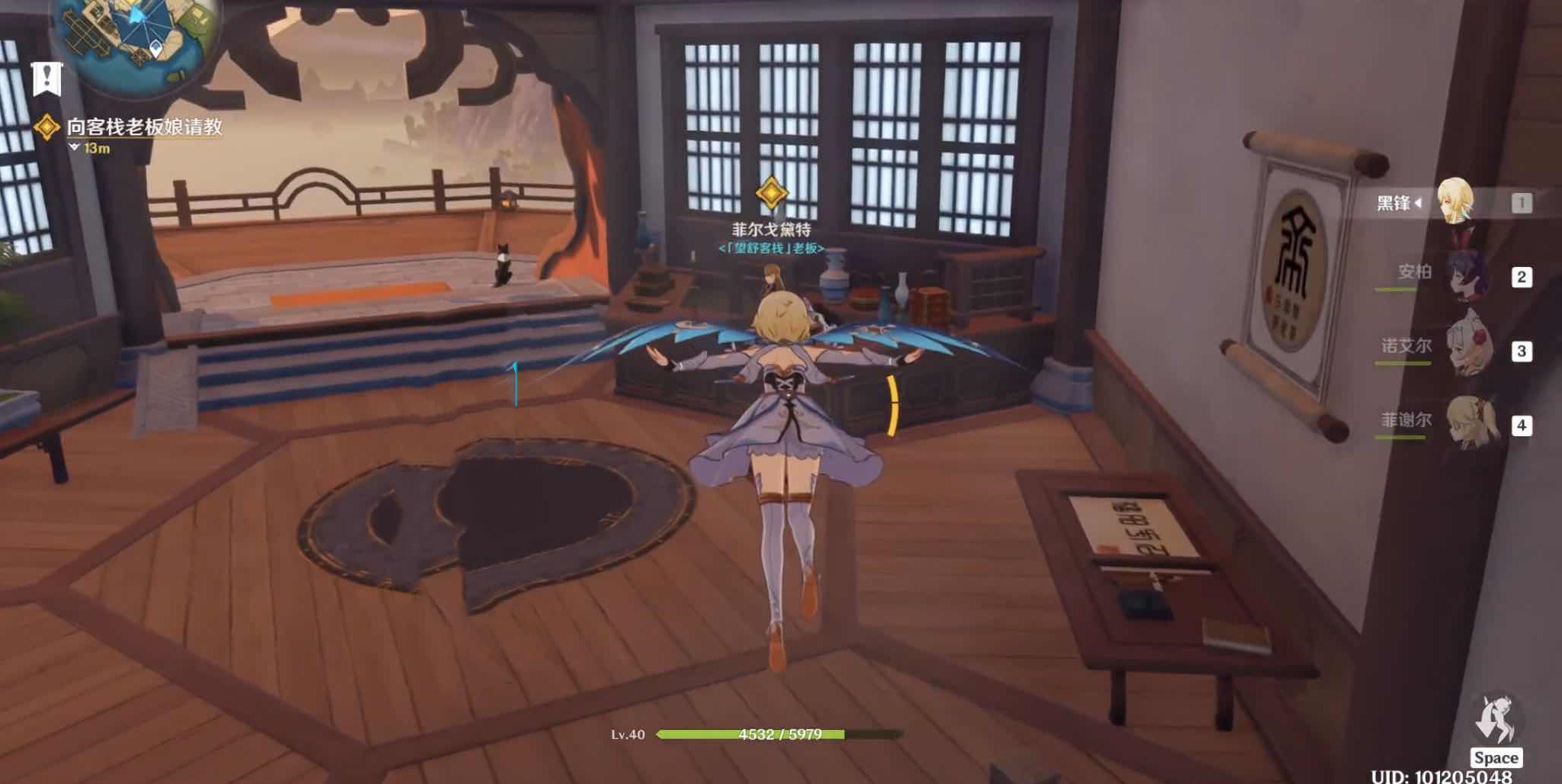 7、与言笑沟通后,再返回客栈二楼找到老板娘,向她说明情况并寻求帮助。