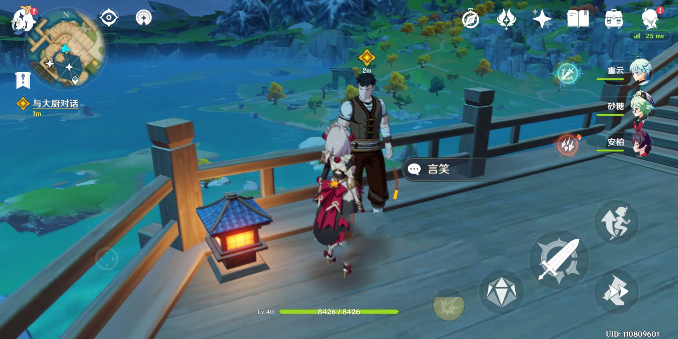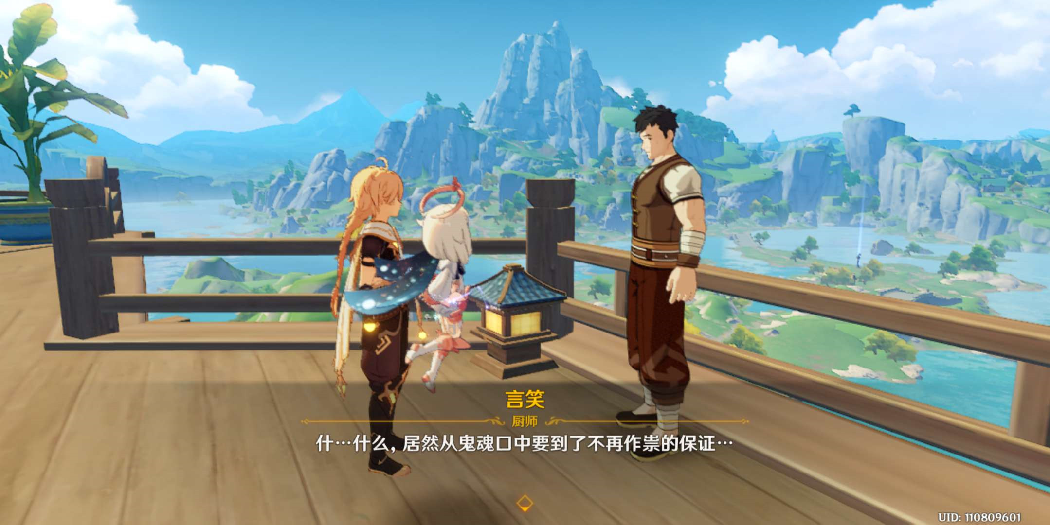4、之后与大厨言笑对话,言笑的位置在客栈二楼的室外区域,到二楼外面就能看到他。