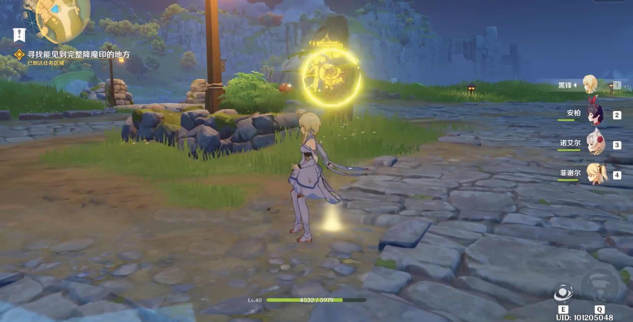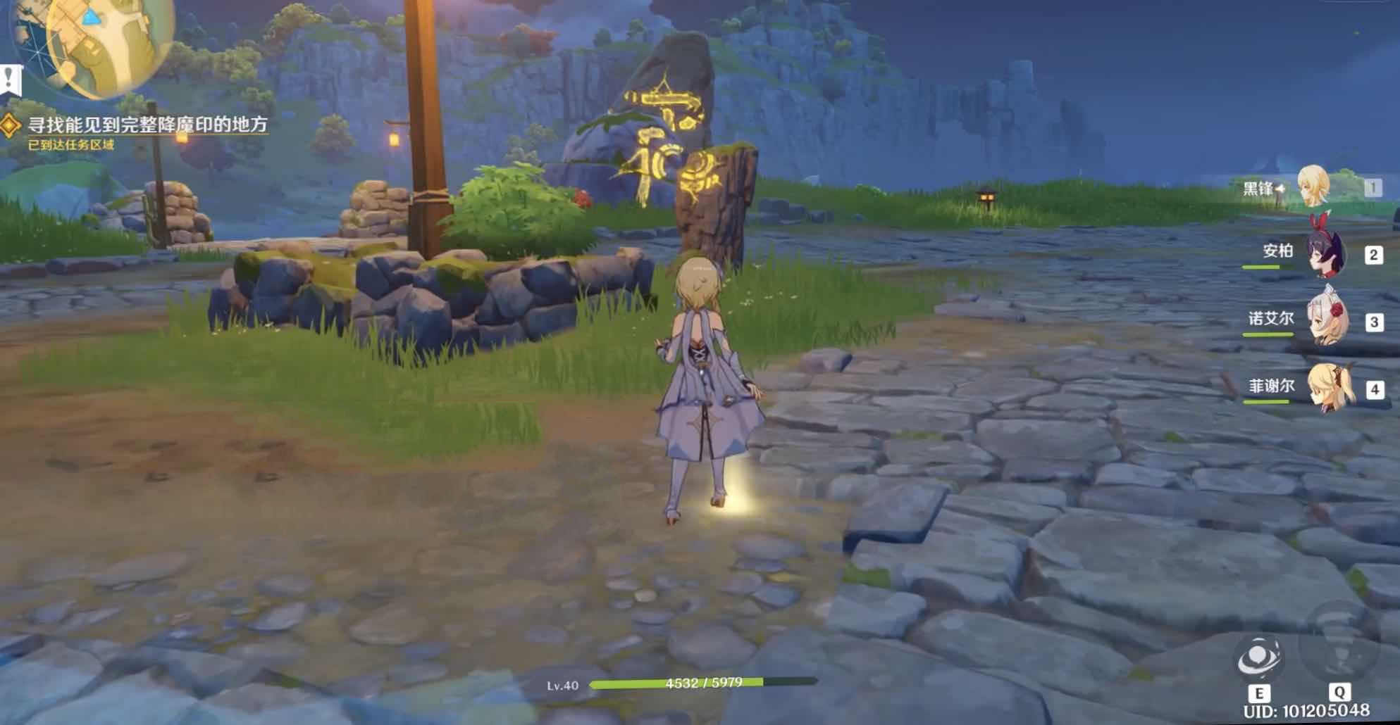 9、接下来要寻找能见到完整降魔印的地方,按照任务提示的区域前往,到达后会看到一个明显的光点。我们站在光点上观察周围的石头,将面前的石头与后面石头上的图案调整拼接成一个完整的圆形,即可完成解密。