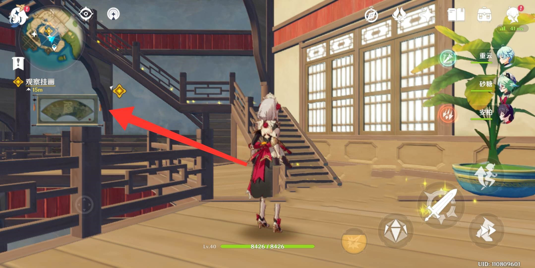 8、根据老板娘的提示观察挂画,需要查看的是客栈楼上悬挂的其中一幅画,重点留意画中的细节。