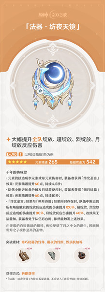 当装备角色附近的队伍成员触发月光绽放反应时,装备角色将获得「新月诗句」效果:元素精通同样提升 60 点,持续时间延长至 10 秒。