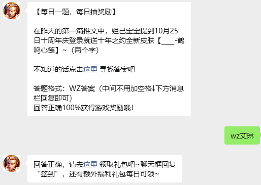 今日问题:在昨天的第一篇推文中,妲己宝宝提到10月25日十周年庆登录就送十年之约全新皮肤【____-鹤鸣心笺】~(两个字)