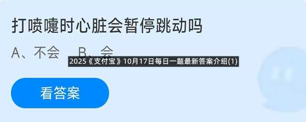 打喷嚏时心脏会暂停跳动吗?这是今天《支付宝》每日一题的问题,相信我们很多用户都很想知道这个问题的答案是什么?这么一个可以领取饲料的机会相信我们很多用户都不想错过,这里羊托游小编为你带来了2025《支付宝》10月17日每日一题最新答案介绍(1)的全部内容,喜欢的小伙伴欢迎点击进入看看吧。