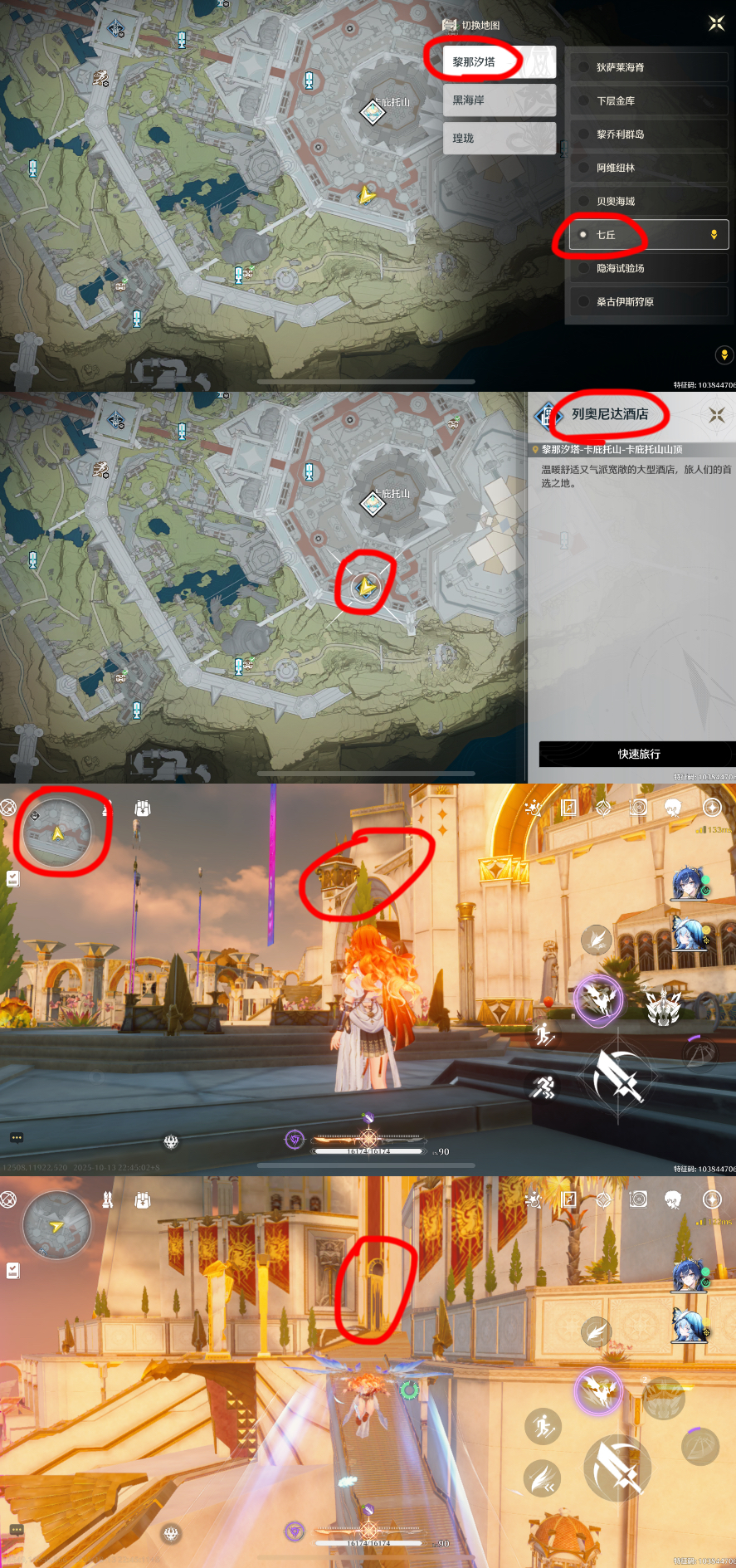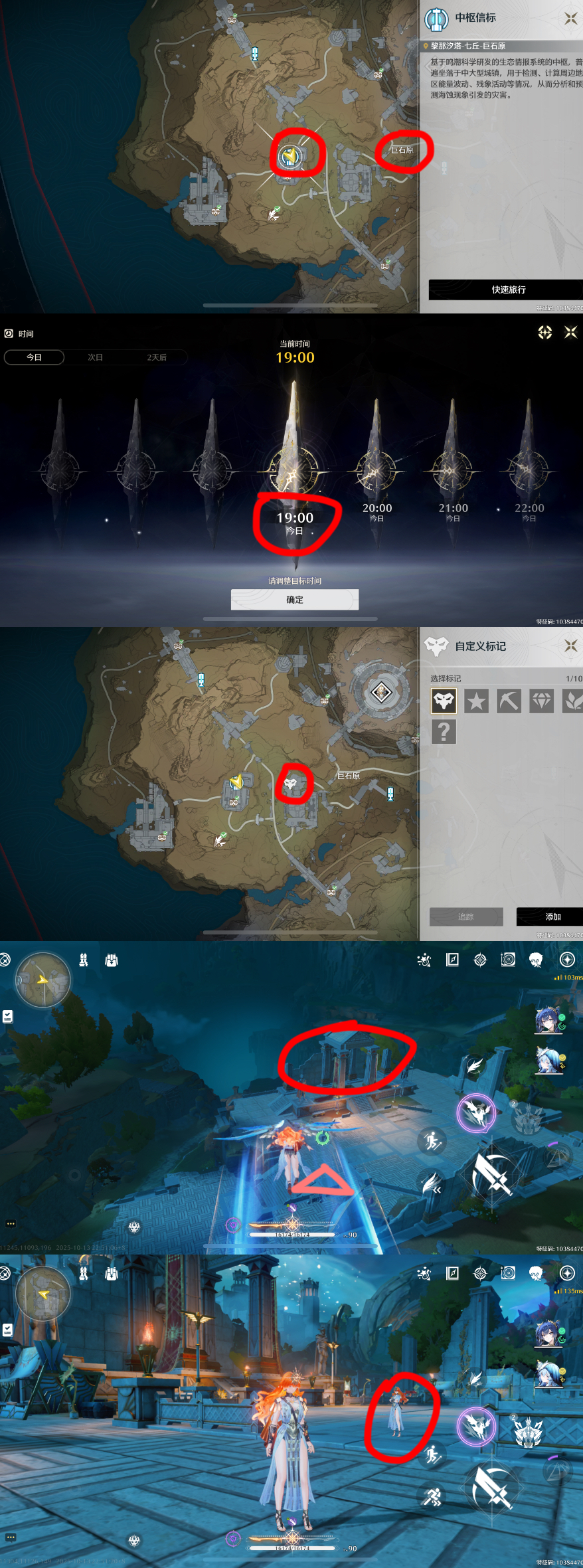 传送至七丘地图左半部分的巨石原 - 中枢信标处,接着打开时间调整功能,将游戏时间调整至次日晚上 19:00;注意要前往下图中标记位置的区域,此时小地图方向需对准东偏南一点点。