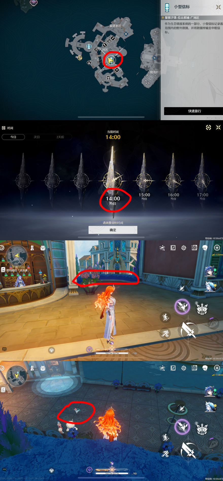 1、先将游戏内时间调整至次日中午 14:00,调整完成后转动角色视角,打开小地图确认正南方向。