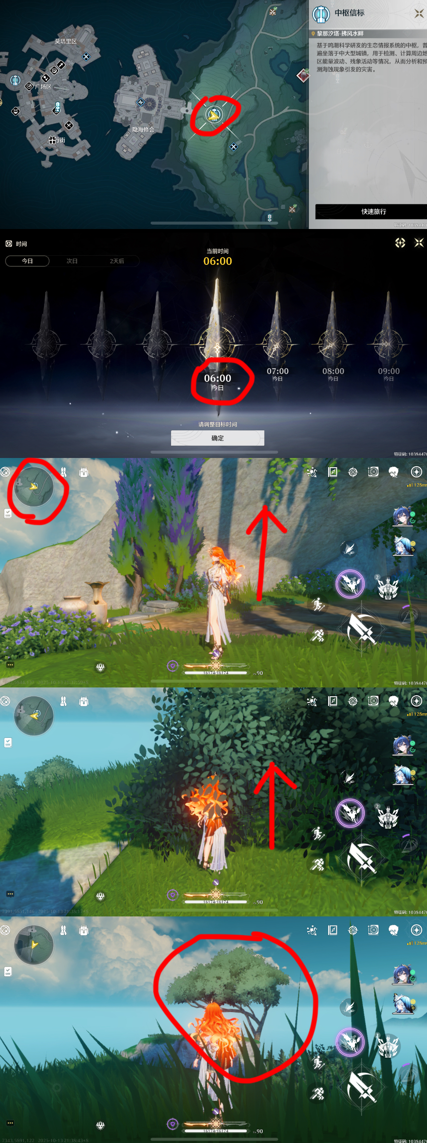 1、首先将游戏内时间调整至次日早上 6:00,时间设置完成后转动角色视角,打开小地图确认西南方向。