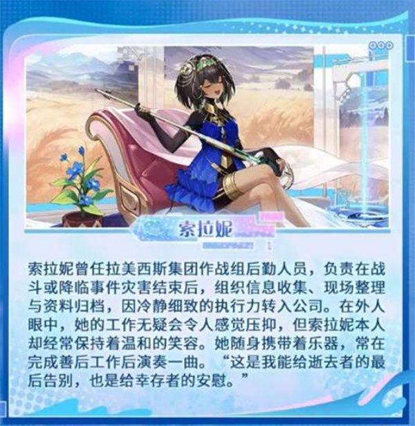 前拉美西斯集团的后勤人员,专责灾后资料整理与档案归类。她做事一丝不苟,性格沉稳,脸上却总挂着温和的微笑。任务完成后,她会弹奏乐器,为逝者送别,也为生者疗伤。