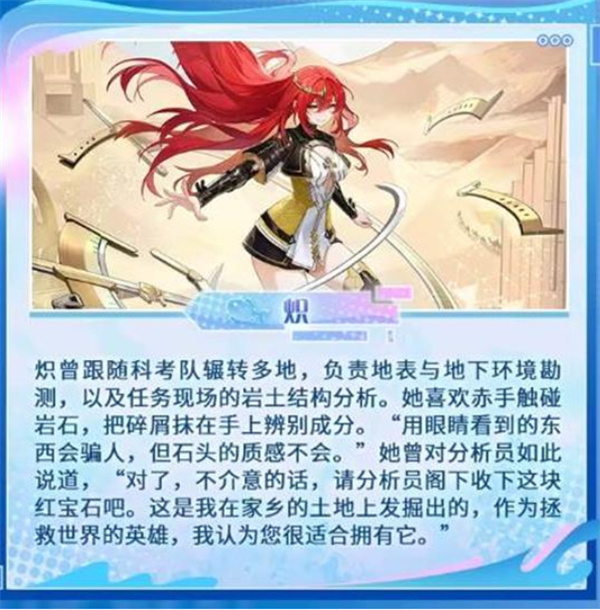 来自科考队的岩土分析师,擅长地表与地下结构的详细勘探。她以徒手触摸岩层的方式辨识矿物成分,坚信“大地永远不会欺骗我们”。炽将一块家乡红宝石赠予团队,寓意守护与信赖。