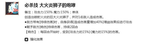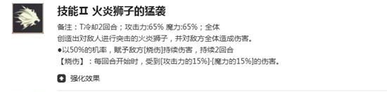 作为一项群体攻击技能,火炎狮子的猛袭能对敌方全体造成65%攻击力与魔力的混合伤害。