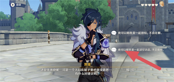 3、选择对话【我可以帮凯亚一起送纪念品,不会麻烦。】继续任务流程。