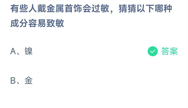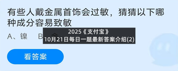 有些人带金属首饰会过敏,猜猜以下哪种成分容易致敏?这是今天《支付宝》每日一题的问题,相信我们很多用户都很想知道这个问题的答案是什么?这么一个可以领取饲料的机会相信我们很多用户都不想错过,这里羊托游小编为你带来了2025《支付宝》10月21日每日一题最新答案介绍(2)的全部内容,喜欢的小伙伴欢迎点击进入看看吧。