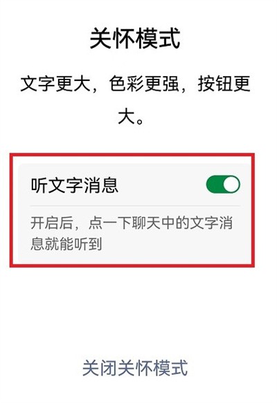 第4步:关怀模式开启后,找到“听文字消息”这一项,点击右侧的滑块将其开启即可。