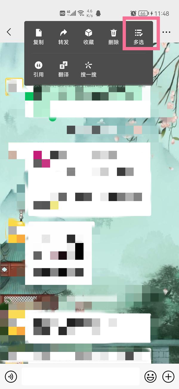 1、在微信聊天界面里,长按你想要保存的那条聊天记录,然后点击【多选】。