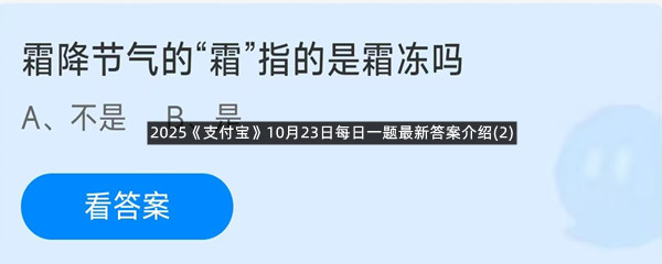 霜降节气的“霜”指的是霜冻吗?这是今天《支付宝》每日一题的问题,相信我们很多用户都很想知道这个问题的答案是什么?这么一个可以领取饲料的机会相信我们很多用户都不想错过,这里羊托游小编为你带来了2025《支付宝》10月23日每日一题最新答案介绍(2)的全部内容,喜欢的小伙伴欢迎点击进入看看吧。