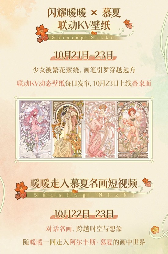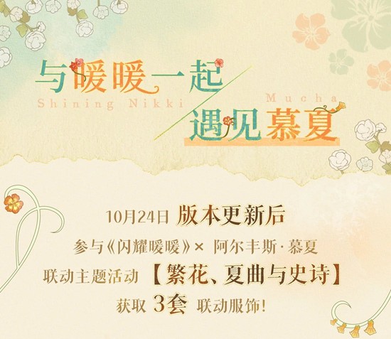 10月24日,参与《闪耀暖暖》× 阿尔丰斯·慕夏的联动主题活动【繁花、夏曲与史诗】,获取精美的3套联动服饰,感受艺术与时尚的梦幻融合!