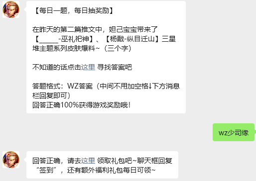 今日问题:在昨天的第二篇推文中,妲己宝宝带来了【______-巫礼祀神】、【杨戬-纵目迁山】三星堆主题系列皮肤爆料~(三个字)