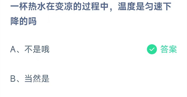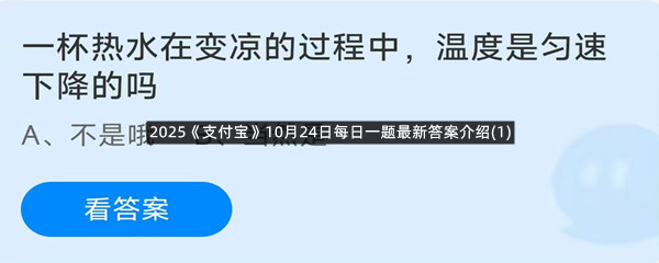 一杯热水在变凉的过程中,温度是匀速下降的吗?这是今天《支付宝》每日一题的问题,相信我们很多用户都很想知道这个问题的答案是什么?这么一个可以领取饲料的机会相信我们很多用户都不想错过,这里羊托游小编为你带来了2025《支付宝》10月24日每日一题最新答案介绍(1)的全部内容,喜欢的小伙伴欢迎点击进入看看吧。