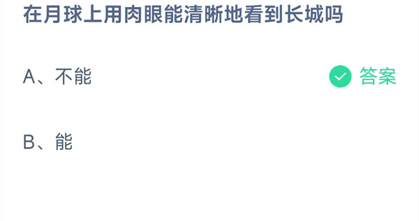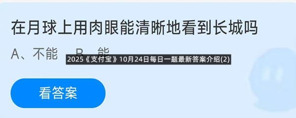 在月球上用肉眼能清晰的看到长城吗?这是今天《支付宝》每日一题的问题,相信我们很多用户都很想知道这个问题的答案是什么?这么一个可以领取饲料的机会相信我们很多用户都不想错过,这里羊托游小编为你带来了2025《支付宝》10月24日每日一题最新答案介绍(2)的全部内容,喜欢的小伙伴欢迎点击进入看看吧。