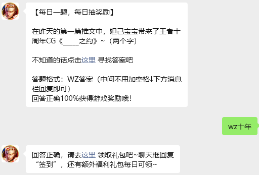 今日问题:在昨天的第一篇推文中,妲己宝宝带来了王者十周年CG《_____之约》~(两个字)