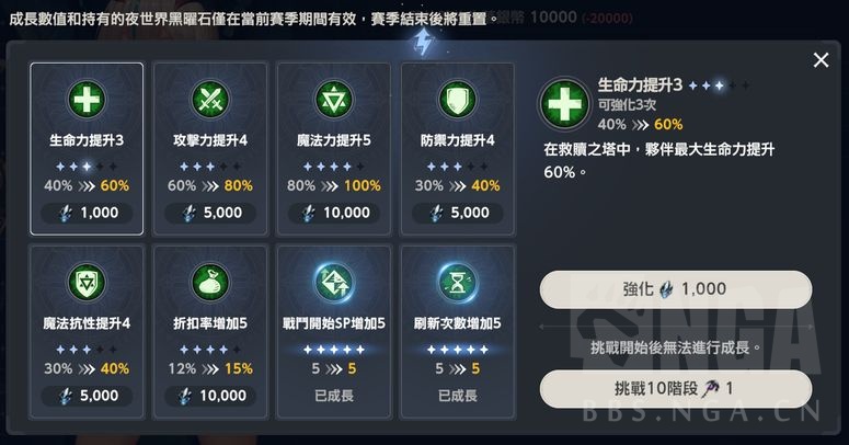 肉鸽塔开局就有升级要素,可以带来大量属性加成。升级所需材料通过通关任意难度获得(通关一次后可以扫荡,每天可以扫荡或挑战3次)。升级后的加成对萌新玩家帮助非常大,所以每天一定记得扫荡满3次。