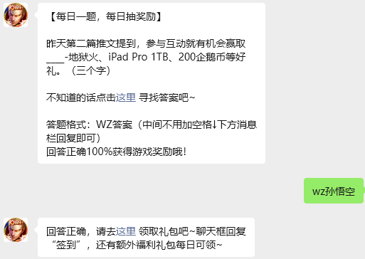 今日问题:昨天第二篇推文提到,参与互动就有机会赢取____-地狱火、iPad Pro 1TB、200企鹅币等好礼。(三个字)
