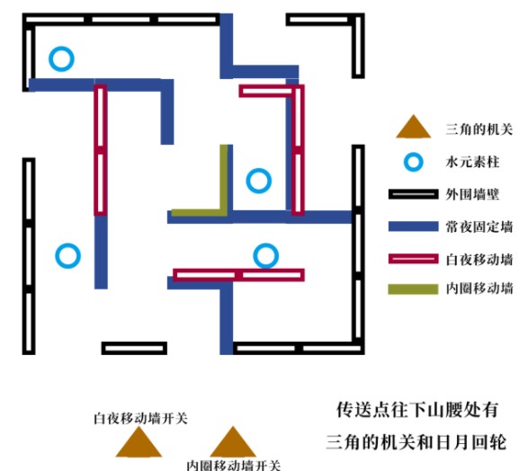 4、迷宫要点:前往迷宫中心内圈的地下室,但需要通过山腰上的三角机关移动迷宫墙壁,同时解锁4个水元素柱。每次触发三角机关,墙壁会顺时针旋转,触发白夜状态会移动一次墙,触发内圈移动墙则再移动一次。